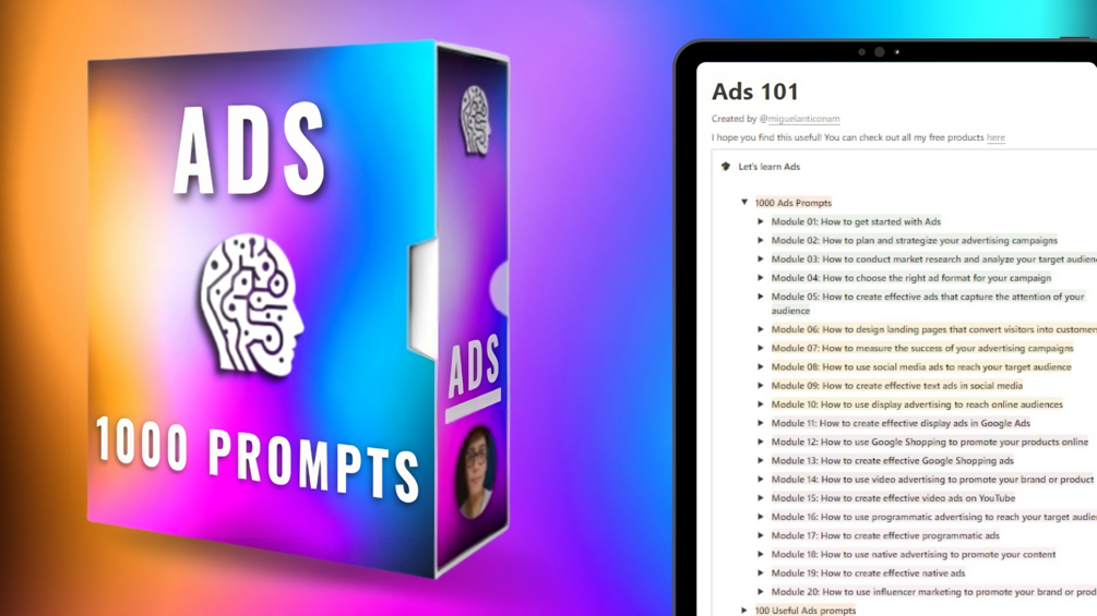 The Ultimate Collection of 1000 Ads Prompts is here to help you unlock the full potential of your advertising strategy! This comprehensive collection offers everything you need to know about creating effective ads that capture the attention of your target audience and drive conversions. Whether you're a beginner or an experienced advertiser, this collection provides valuable insights and strategies to help you optimize your advertising, social media marketing, and brand building processes and create a campaign that is personalized and effective at achieving your business goals. -