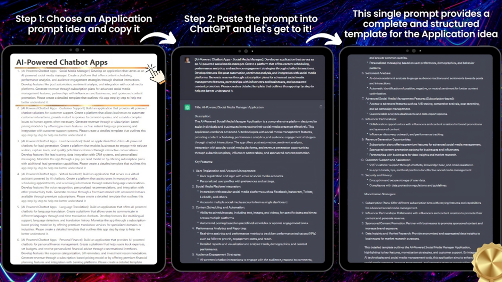 - With this collection, you can explore a variety of application ideas such as AI-Powered Chatbot Apps, Business Expense Tracking Apps, Customer Relationship Management (CRM) Apps, Lead And Sales Management Apps, Financial Market Forecasting App, Social Media Management Apps For Businesses, Web Traffic Analysis Apps and much more. These application ideas prompts will allow you to tap into your creativity and generate new application ideas without getting stuck.