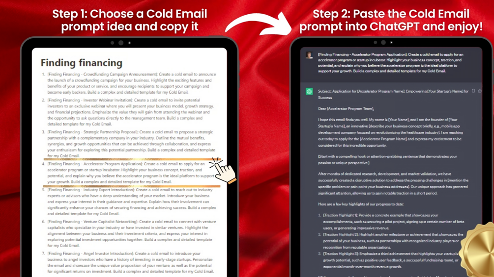 - With this collection, you can explore a variety of Cold Email idea categories such as Angel Investor Finding, Discount Offer Promotion, Finding Financing, Free Trial Offer Promotion, Pre-Launch Campaign promotion, and much more. These cold email idea prompts will allow you to tap into your creativity without getting stuck.