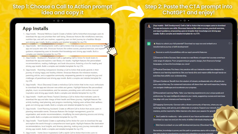 The Ultimate Collection of 10,000 Call to Action Idea Prompts Bundle is the Maximum solution for boosting user engagement, optimizing conversions, and taking your business to the next level. With this massive collection, you'll gain access to a wealth of CTA idea prompts that will help you craft personalized and compelling messages that inspire action and drive results. Whether you're running email marketing campaigns, social media ads, or website pop-ups, or if you're simply looking to dig deeper and have a variety of calls to action at your disposal for future projects, the Ultimate Collection of 10,000 Call to Action Prompts covers a wide range of categories to explore. This allows you to tap into your creativity and generate new ideas without getting stuck -
