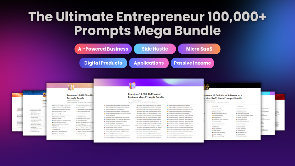 The Mega Collection of 100,000+ Ultimate Entrepreneur Prompts is here to turbocharge your entrepreneurial journey. These extensive and structured bundles are tailored to exponentially amplify your creativity. Bid farewell to creative blocks and embrace innovative breakthroughs powered by AI, leveraging the power of these 100,000+ prompts. Gain a competitive edge and turn your ideas into reality, propelling your entrepreneurial path to unparalleled heights. -